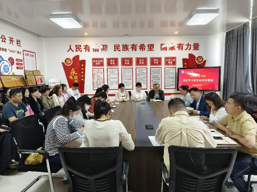 4月23日,文化教育学院在五区党员活动室召开全体党员会议,学习贯彻习近平总书记关于党纪学习教育的重要讲话和重要指示精神,全面落实中央、省委、市委和学校党委有关要求,对学院党纪学习教育工作进行动员部署。学院党总支书记展贤东,院长史丽珍,副院长于慧娟、李炯,学管办主任普俊,教管办主任马淼,综合办主任石永丽及全体党员教师参加会议。会议由党总支书记展贤东主持。