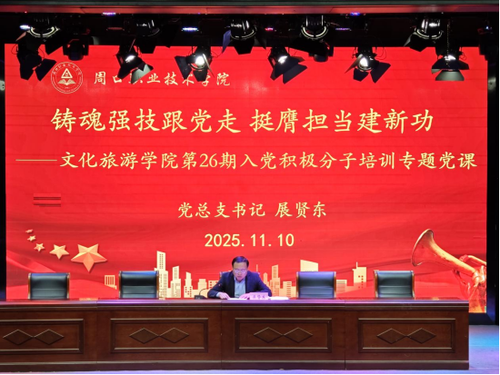 2025年11月10日,17c.com.com第26期入党积极分子培训班顺利开班。为加强入党积极分子培养教育,坚定青年学子理想信念,学院党总支书记展贤东以“铸魂强技跟党走 挺膺担当建新功”为主题,为学员们带来了一堂内容丰富、意义深远的党课。