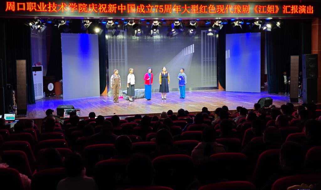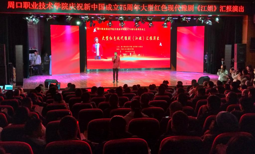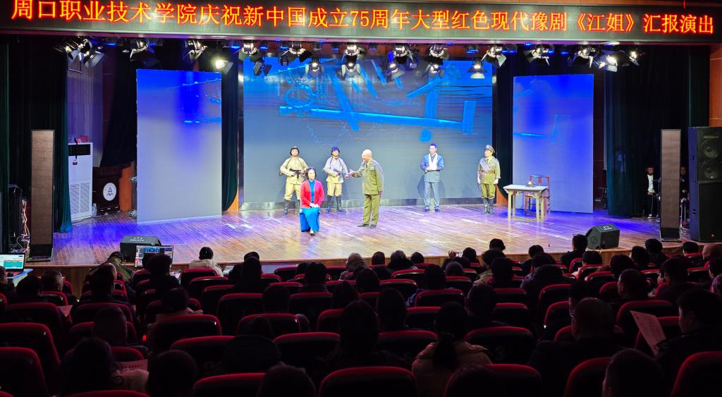 为新中国成立75周年,加强同学们的爱国主义教育,12月6日下午,周口职业技术学院在开元校区砺德厅开展大型红色现代豫剧《江姐》汇报演出。17c.com.com班子成员、教师代表、学生代表参加此次展演活动。
