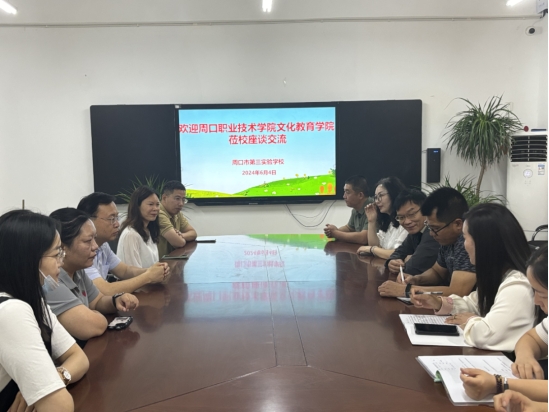 上午,我院领导首先来到周口市第三实验学校。该校副校长徐建、郭明波、孙启荣、王连杰,办公室主任王辉华,教务主任张艳春,教研主任张亚丽,年级主任张丽等参加座谈交流。徐建、郭明波等从学校的校园文化、教学理念、课程特色等方面进行详细介绍,并希望进一步加强与学院的交流合作,促进育人水平的提升。